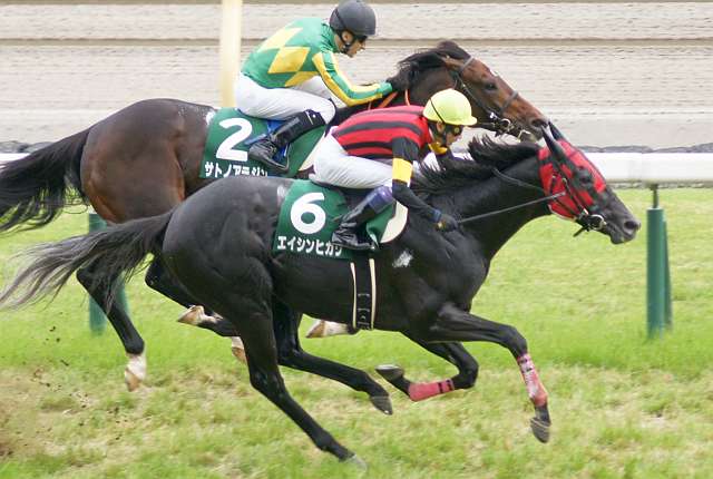 2015年エプソムカップのゴール前写真。逃げ切ったエイシンヒカリもクビ差に詰め寄った2着サトノアラジンも、レース前は重賞タイトルのない一介のオープン馬に過ぎなかった。それがこのエプソムカップでの好走をきっかけにGⅠホースにまで上り詰めることになる。そしてこの2頭にはもうひとつ共通点がある。それはどちらもディープインパクト産駒で母の父はストームキャットという点だ。