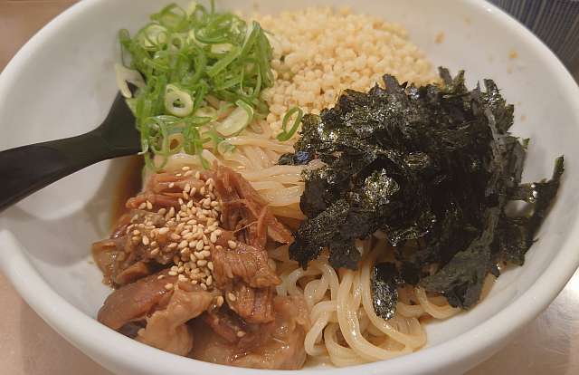 コシのある太麺の上には、刻み海苔、天かす、青ネギ、そしてぼっかけ。器の底には濃い目のタレが潜んでいる。そこに別添えの生卵を割り落として、卵とタレがまんべんなく麺に行き渡るようにひとしきり混ぜたのち、やおら麺を啜ってみた。悪くはない。タレはぼっかけよろしく甘辛く、とても濃い味付けなのだが、卵がそれをマイルドにしてくれている。しかし、よくよく見たらコンニャクの姿がない。これじゃあ「ぼっかけまぜそば」ではなく「牛スジまぜそば」じゃないの?