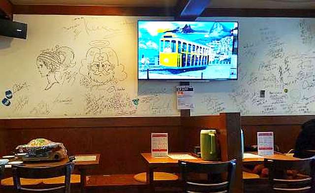 店内に入るといりこの香りがぷうんと鼻をくすぐった。1年前と変わらない。大阪では「讃岐うどん」と銘打ちながら関西風にアレンジされた一杯を出すお店が多い中、こちらは純粋な讃岐スタイルを貫いている。いりこダシもそのスタイルの現れであろう。カウンター席に座ると向こうの壁一面に書かれたサインが目に飛び込んでくる。有名人の常連も多い。