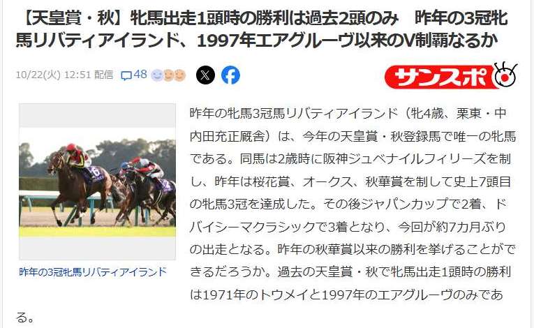 紅一点のリバティアイランドは、単勝1番人気に押されたものの、まさかの13着に敗れた。この結果を受けて「やはり牝馬が1頭しか出走していない天皇賞秋で牝馬が勝つのは難しいのか」と思う人が多くいたとはとても思えぬ。敗因は彼女の「不機嫌」にあったとされているが、ひょっとしたら彼女もこのネットニュースを読んでしまったのではないか。私はそれを密かに疑っている。